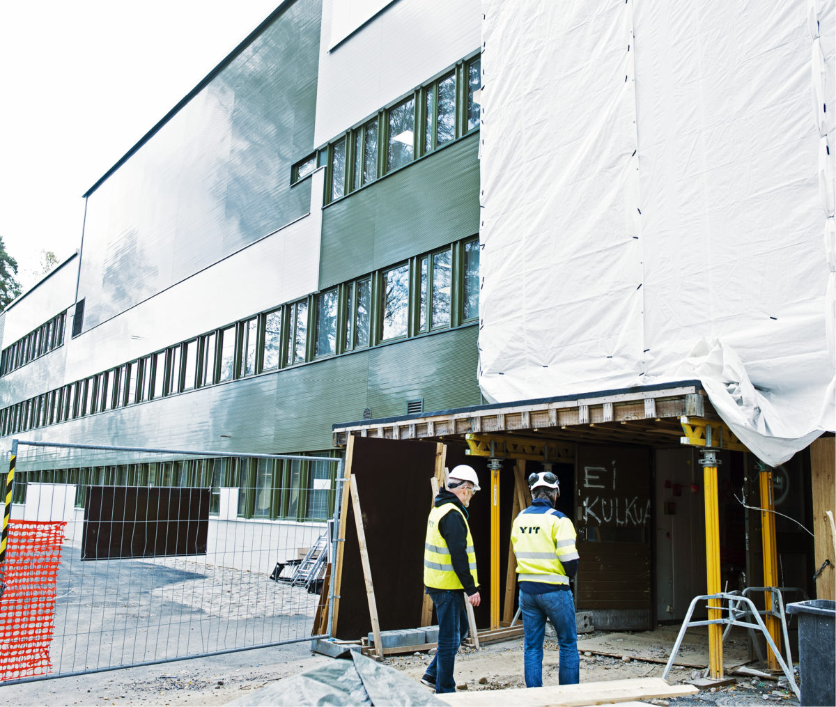 Kolmikerroksisen rakennuksen tasakatolla töitä tehdään sääsuojateltan sisällä. Vanha kattopinnoite ja eriste on poistettu ja uutta tehdään vauhdilla. Entisen lecasoraeristeen tilalle tehdään uusi monikerroseristys. Betonipinnan päälle valetaan noin 30 millimetrin tasausvalu, jolle asennetaan kaksi 170 millimetrin villakerrosta. Villan päälle tehdään kevytsorapavuilla kaadot, jonka päälle tulee 50 milliä villaa ja vedeneristys pintaan. Pintakerroksena on kaksi bitumilla yhteen liimattua hitsattua kermikerrosta.