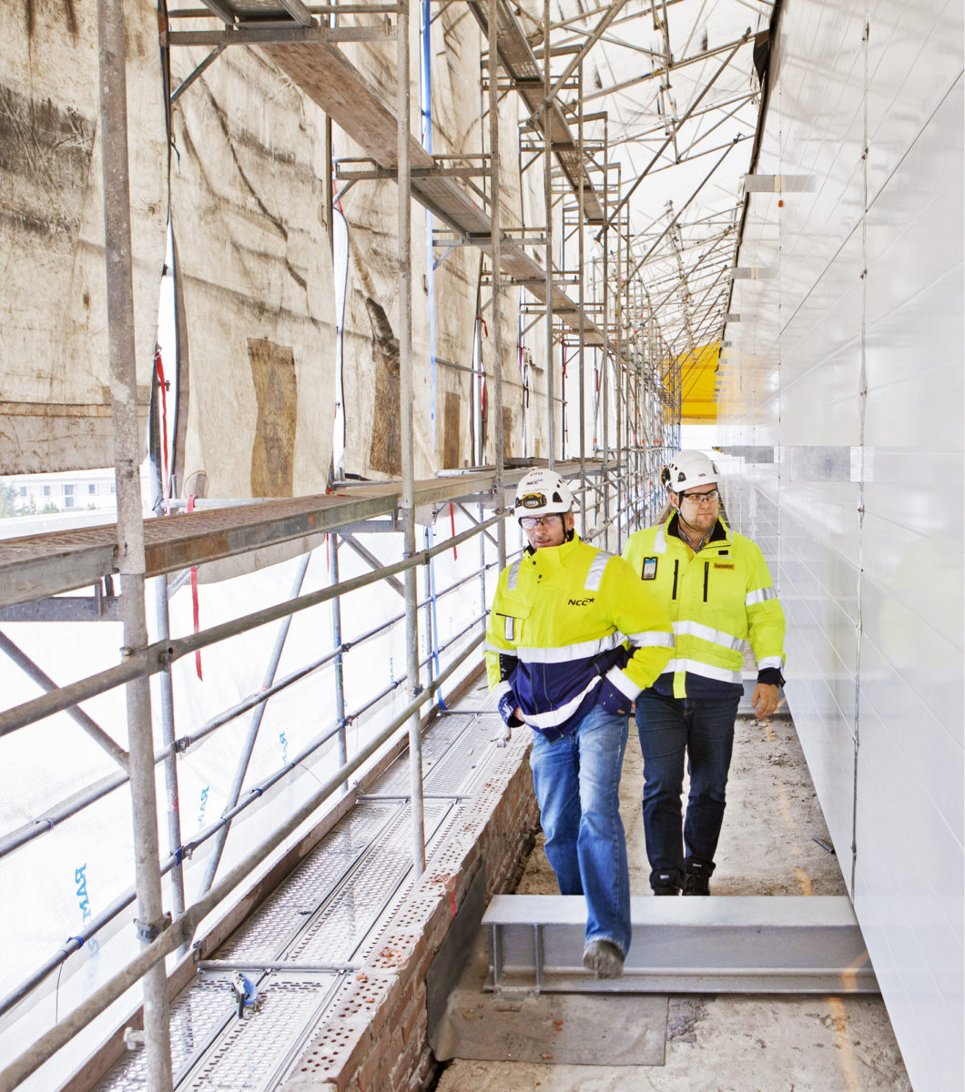 Jyväskylän ammattioppilaitoksen Harjun kampuksen alueella Ramirentin logo heiluu hulmuilevassa valkoisessa sääsuojassa, jotka peittää NCC:n urakoiman liikuntasalirakennuksen maasta kattoon. Vastaava työnjohtaja Harri Lampinen kertoo, että rakennus huputettiin heti, kun runko oli pystyssä.